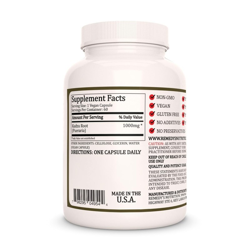 - WHAT YOU GET: 1 two month supply bottle of Remedy's Nutrition Kudzu Root extract supplement with sixty 1000mg vegan capsules.