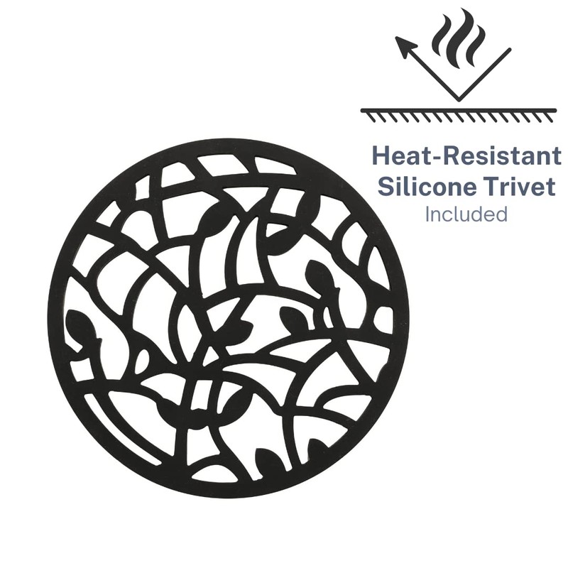 - The pie pan comes with a beautiful heat resistant silicone trivet that protects your countertop from the heat.