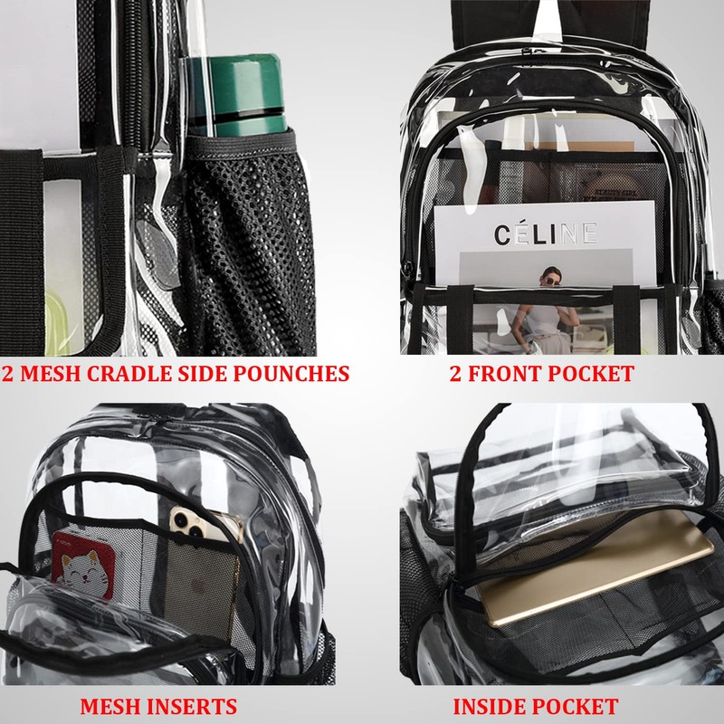 - Multi-functional compartments & large capacity:Size:17 x 12 x 6 inches (H x L x W); One large main double zipper compartment for binders,laptops,books,etc.;two front compartment for notepads;glasses;etc.;the firs single zipper compartment,which have one big mesh slots with single zipper for phone;cash;cards;etc.;and two small open mesh slots for pens;tissues;keys;etc.; two side mesh pouches for water bottles or folding umbrellas.The clear backpack affords decent room for different purposes.