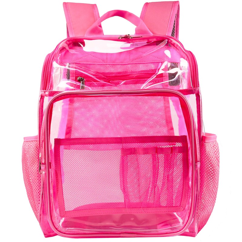- TOP LOADER OPEN CLEAR BACKPACK : This large see through backpack has 1 main spacious main compartment with SBS dual zipper; 1 inner mesh bag with zipper, two side mesh pockets and two inner side mesh pockets; 1 large front pocket, 4 pencil small mesh pockets and two mesh pockets. This heavy duty clear backpack provides appropriate for different uses space and preventing them from sliding and bumping