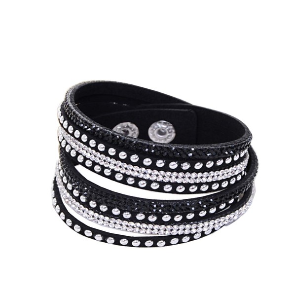 KUIYAI Wrap Leather Bracelet with Bling Bling Crystal Rhinestones and Snap buttons (Black)