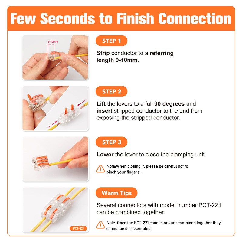 Warm tips:If you're looking to make your wiring neater, you can join two or more PCT-221 wire nuts connectors together. However, please note that once they are joined, they are difficult to disassemble.