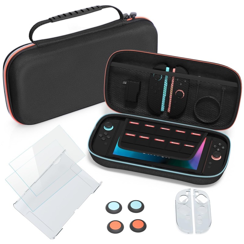 KujectアクセサリーセットSwitch 2専用 収納ケース+スクリーン強化フィルム+シリコン保護カバー+サムグリップキャップ 耐衝撃 防塵 防汚 大容量 持ち運び便利 (ブラック)