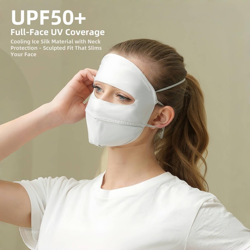 KUKASEN UPF 50+ Full Face Sun Mask – Ice Silk Cooling & Breathable, Adjustable Ear Loops, Reusable UV Face Cover for Women
