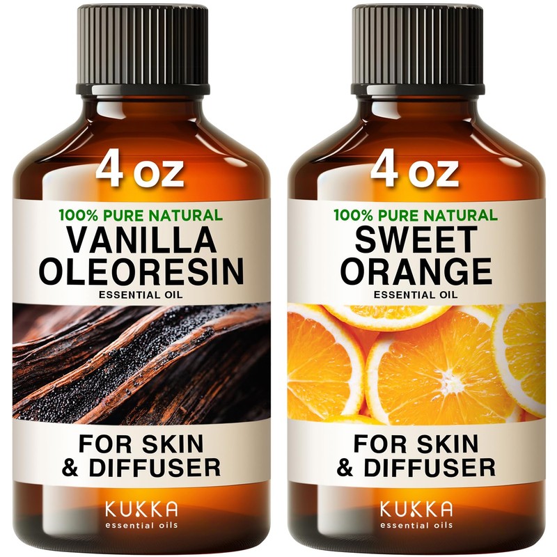 KUKKA essential oils Vanilla Essential Oil for Diffuser & Orange Essential Oil for Diffuser Set - 100% Natural Aromatherapy Grade Essential Oils Set - 2x4 fl oz - Kukka
