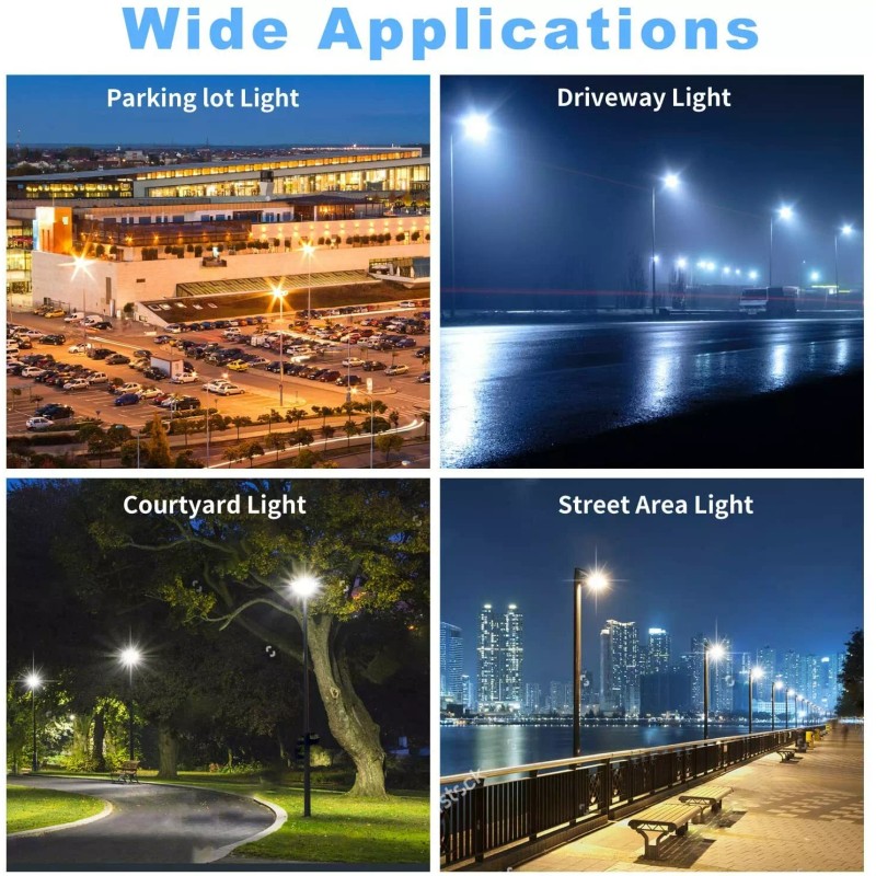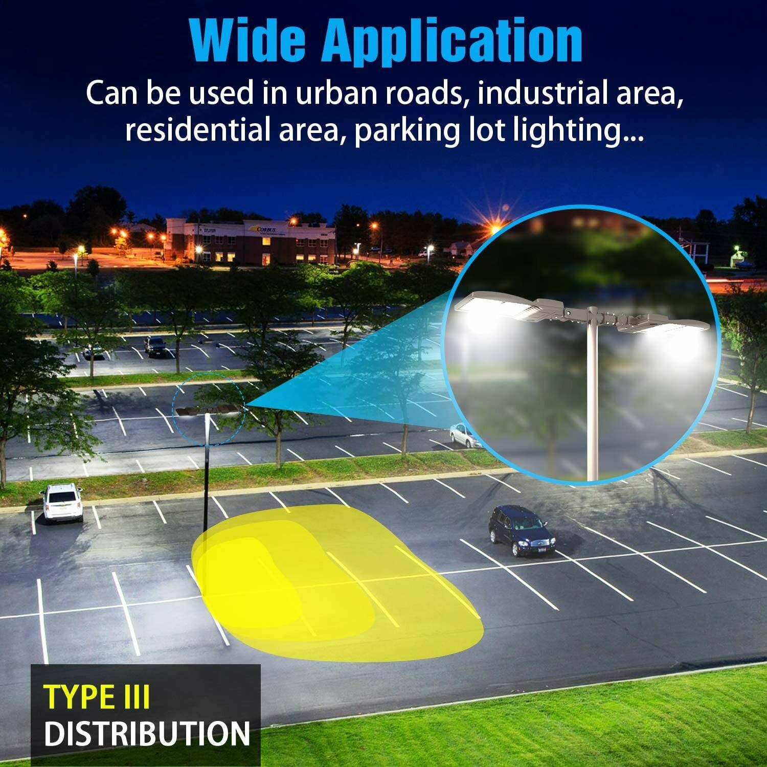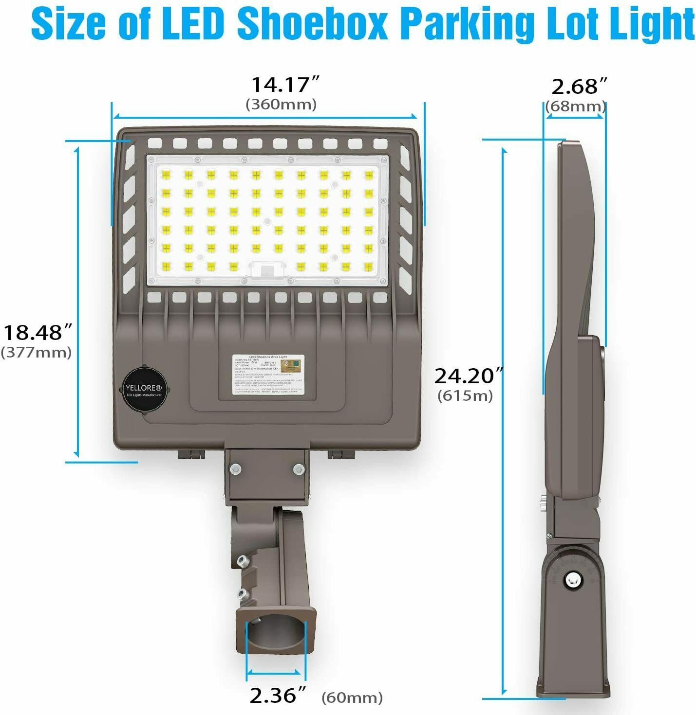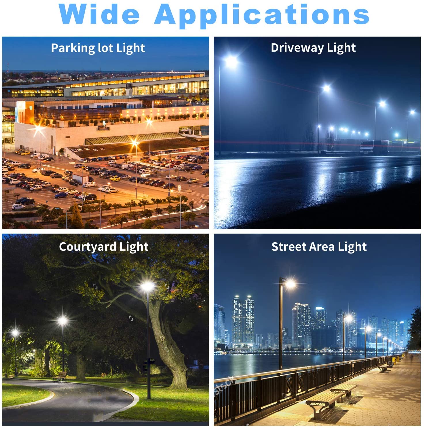 IP65 28000LM Parking Lot LED Lights-- Our led outdoor lighting maximum output of 21000lm. The shoe box light fixture uses high-efficiency LED chips SMD3030 which can reach 130Lm/w, Saving 75% electric bill instantly. It can reduce your electricity running cost, meanwhite makes for a brighter and more sustainable lighting solution. Exceptional Durability -- This LED area light only uses premium grade LED components. It constructed of a heavy duty die-cast aluminum housing with polyester powder-coated finish and full sealing for resistance of rust, corrosion and contaminants, Heat dissipation is optimized with an integral secondary heat sink which ensure 50000 Hours lifespan. Wide Application -- The street area light can be used widely as parking lots light, driveway light, backyard light, residential area light, outdoor area light,public entrances lot, roadways light, pedestrian walkways, Parking garages, Gas station light, Highway Lighting, Park, Sport Lighting, Square Lighting and other outdoor applications lights. Certified And Warranty -- The outdoor security light is UL Listed and DLC verified for safety and rebate eligibility. 5 Years warranty direct from us. Any problem or question, please feel free to contact us. We will response within 24hrs.
