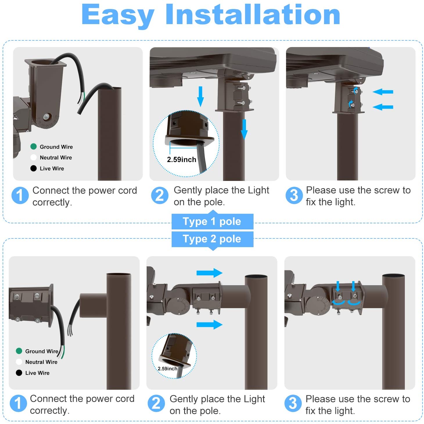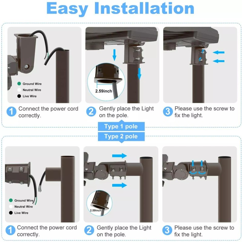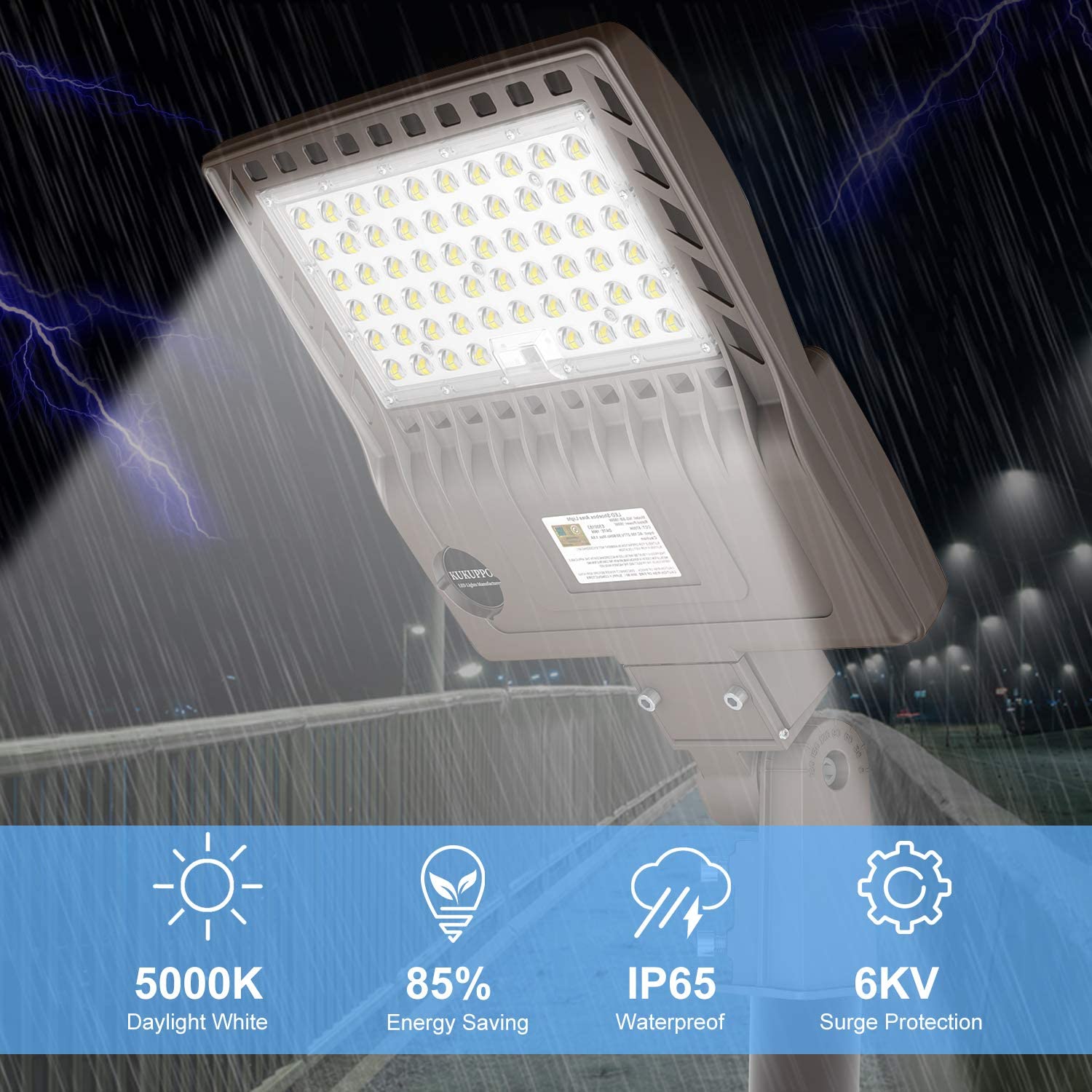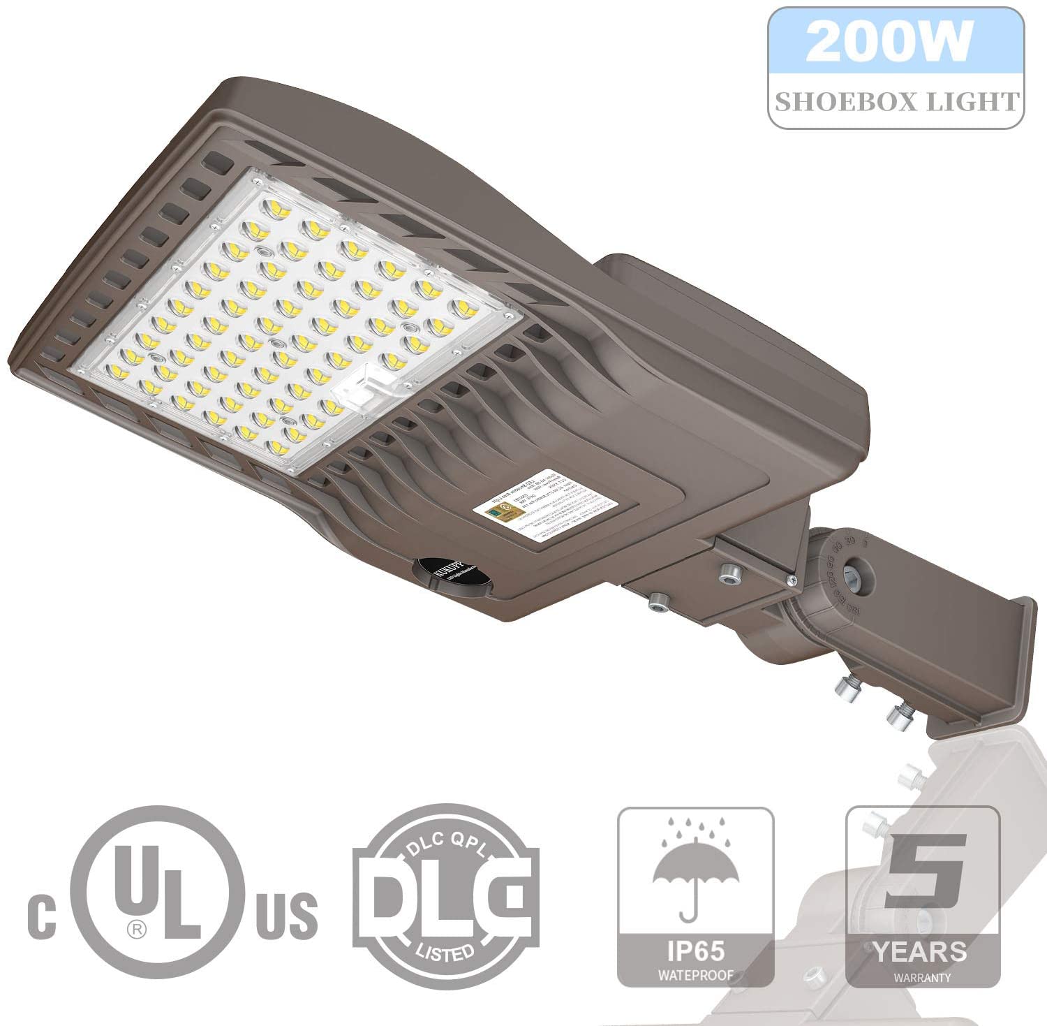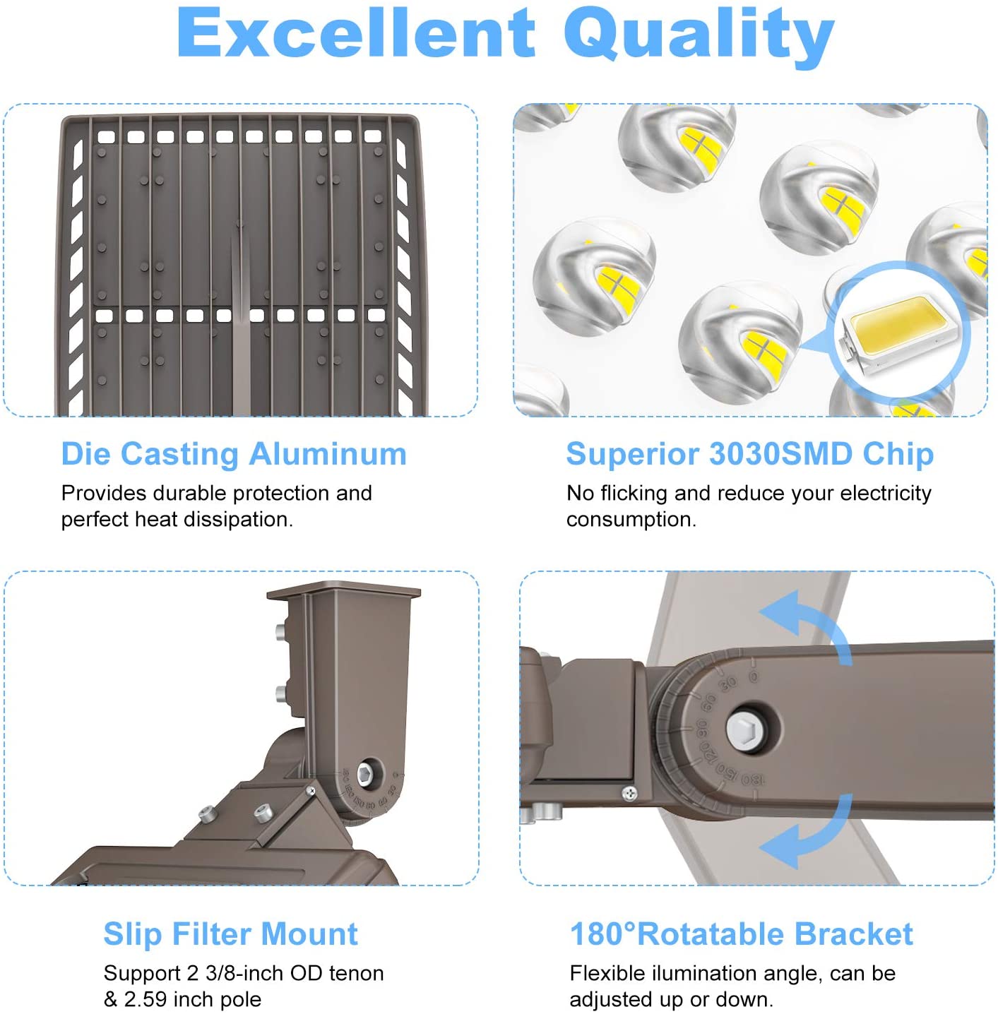 IP65 28000LM Parking Lot LED Lights-- Our led outdoor lighting maximum output of 21000lm. The shoe box light fixture uses high-efficiency LED chips SMD3030 which can reach 130Lm/w, Saving 75% electric bill instantly. It can reduce your electricity running cost, meanwhite makes for a brighter and more sustainable lighting solution. Exceptional Durability -- This LED area light only uses premium grade LED components. It constructed of a heavy duty die-cast aluminum housing with polyester powder-coated finish and full sealing for resistance of rust, corrosion and contaminants, Heat dissipation is optimized with an integral secondary heat sink which ensure 50000 Hours lifespan. Wide Application -- The street area light can be used widely as parking lots light, driveway light, backyard light, residential area light, outdoor area light,public entrances lot, roadways light, pedestrian walkways, Parking garages, Gas station light, Highway Lighting, Park, Sport Lighting, Square Lighting and other outdoor applications lights. Certified And Warranty -- The outdoor security light is UL Listed and DLC verified for safety and rebate eligibility. 5 Years warranty direct from us. Any problem or question, please feel free to contact us. We will response within 24hrs.