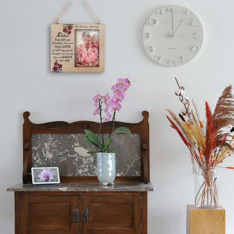• Photo Frame Engraved Text: "In Loving Memory - Sister you left me beautiful memories, your love is still my guide. Though I can't see you, you are always by my side."