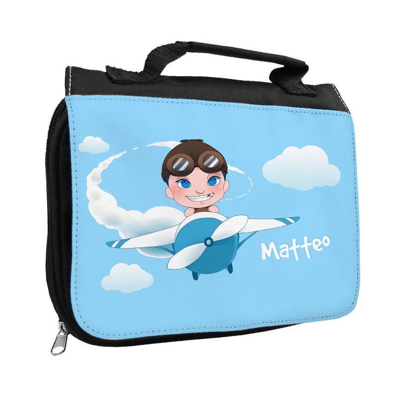 Kulturbeutel mit Namen Matteo und schönem Motiv mit Flugzeug und Pilot für Jungen | Kulturtasche mit Vornamen | Waschtasche für Kinder