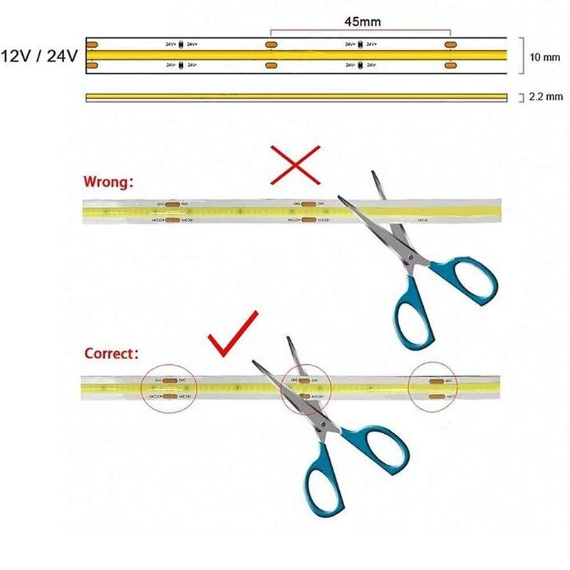 - 5mm width 3.3feet/1M cob high lights strip.(pls connect 12v plug power supply,)Safely to Use.Highly color-rendering index and lighting effect, no ultraviolet and infrared rays, no contain mercury, lead and other heavy metals, environment friendly.