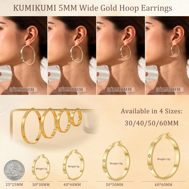 - Earring Size: 5MM gold hoops earrings are available in three sizes: 30MM/40MM/50MM. Each hoop earrings is inlaid with dazzling cubic zirconia. The style is simple and exquisite. Whether you are dressed up for a party or elegantly enjoying brunch, this versatile earring can add a touch of sophistication and elegance to any look.