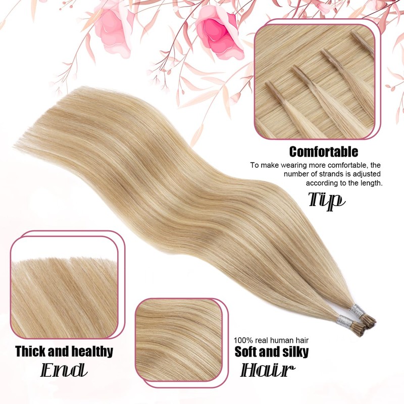 Kun Na I Tip Hair Extensions 60 Strands 45g/pack Pre Bonded Stick Tip Keratin Real Remy Human Hair Extension Ash Blonde Mix Bleached Blonde Straight 16 inch