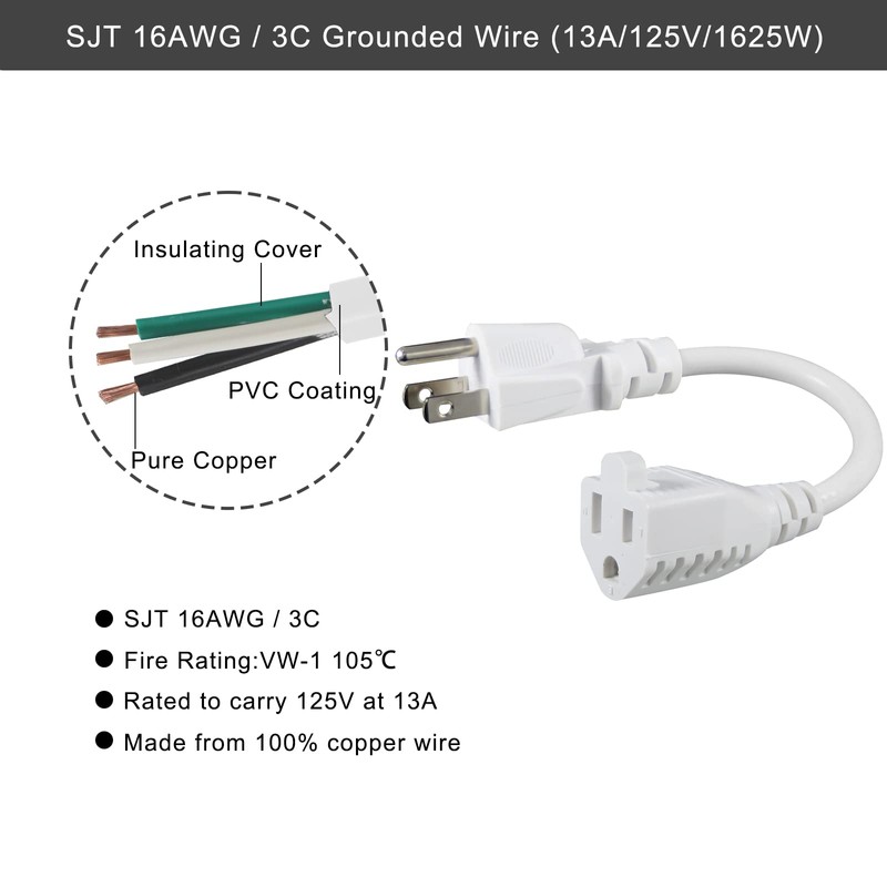 - 【3 Prong Extension Cord】 8inch extension cord AC 125V/13A/1625W power rated, indoor short extension cord.