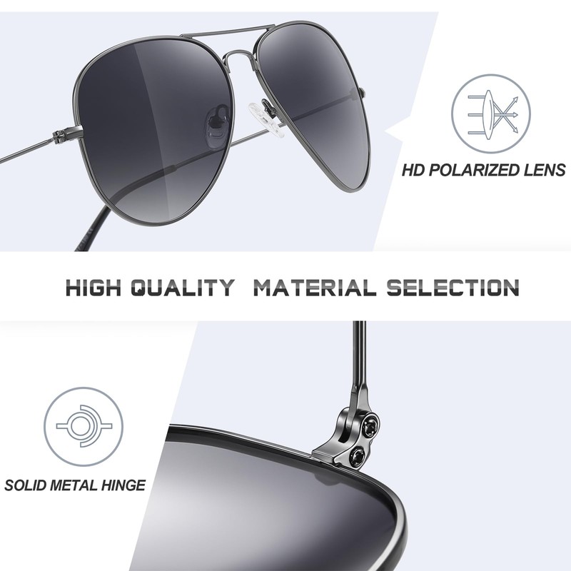 - HD POLARIZED LENS: Kunchu aviator polarized sunglasses lenses block 99.99% of harmful glare from reflective surfaces like water, snow and roads while enhancing visual contrast.Suitable for driving, outdoor fishing and skiing. Protect your eyes from UV rays and reduce long-term damage while enjoying clear vision