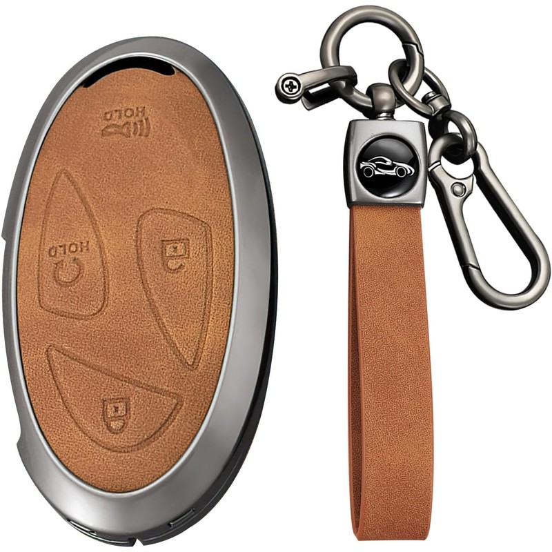 Material: This key shell is made of Zinc alloy(metal frame)and pu leather ,the weight of the key cover is within a reasonable range.Provide double protection for your key fob.The button position does not affect the sensitivity when the button is pressed.
