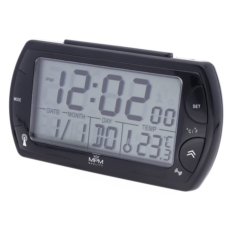 Kunststoffwecker MPM - Wecker, Wiederholungsalarm, Funkgesteuert, Licht, Thermometer, Datum/Tag, Wecker für Haushalt, Schlafzimmer, Bürowecker, 2X AAA Mikrobleistiftbatterie, 120 x 64 x 40 mm