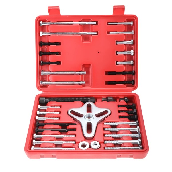 KUNTEC 46Pcs Harmonic Balancer Puller Kit – Flywheel Remover, Crankshaft Pulley Removal, Steering Wheel Pulling Set (Red)