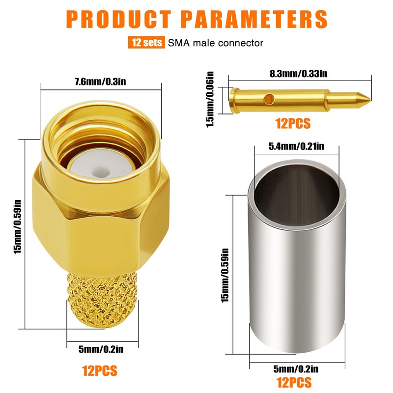 KUOQIY 12pcs SMA Male Crimp, SMA Male Crimp Gold-Plated RF Connector, for RG58 / RG400 / RG142 / LMR195 Cable