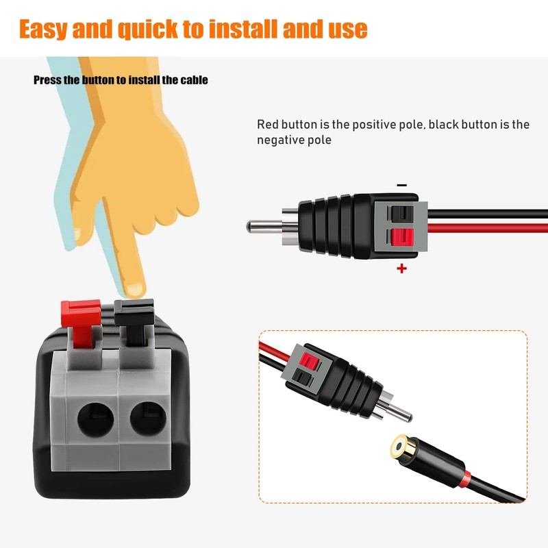 - Easy to Use: RCA Female and Male to AV 2 Screw Terminal Female Adapte is small and easy to carry, and the positive and negative poles are easy to distinguish. The red button is positive and the black button is negative.
