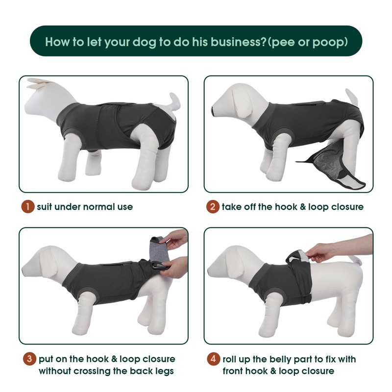 - Dog bodysuit after surgery: the surgery dog has an adjustable back length and Velcro fastener, which makes it easier to put on and take off the dog shirt. The bodysuit can be rolled under the stomach and fixed with Velcro