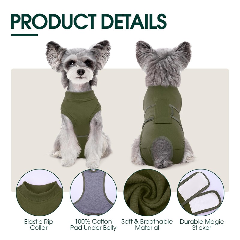 - Dog bodysuit after surgery: the surgery dog has an adjustable back length and Velcro fastener, which makes it easier to put on and take off the dog shirt. The bodysuit can be rolled under the stomach and fixed with Velcro