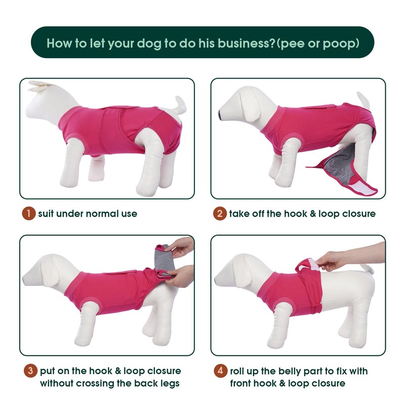 - Dog Surgery Suit Sizes: Our female spay dog surgery suit comes in 6 sizes: XS, S, M, L, XL, and XXL. The belly is equipped with an adjustable magic sticker, ensuring that all small, medium, and large dogs can wear this dog surgical suit comfortably