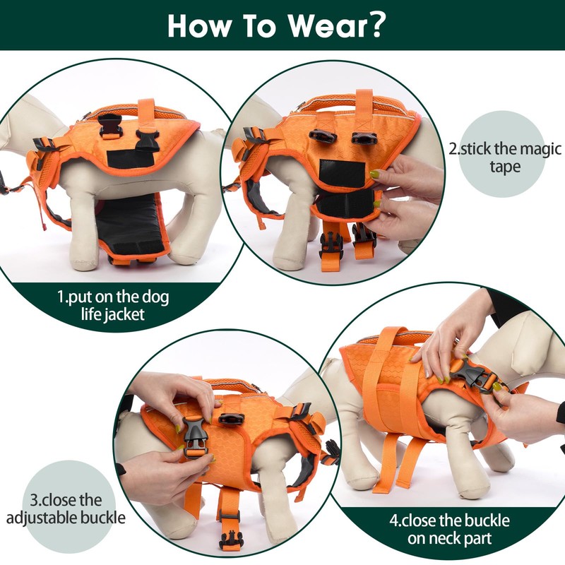- Adjustable Dog life Preserverdog life preserver belly and neck are designed with sturdy adjustable nylon straps and double-row quick-release buckles with magic sticker panels to provide double security for your dog. These designs are easy to put on and take off