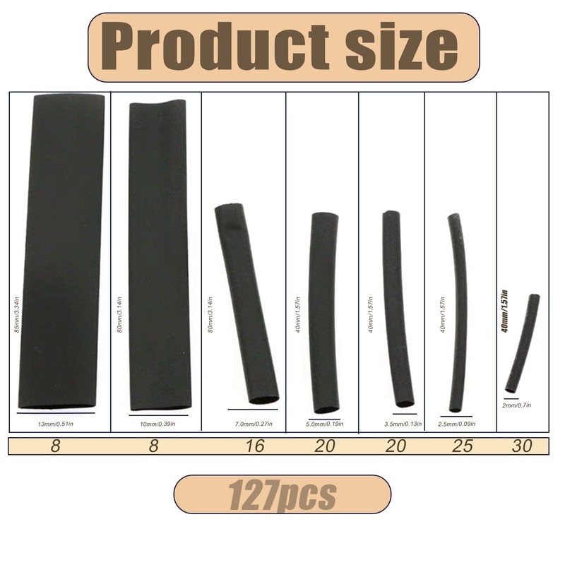 - Specifications: This heat shrink tubing kit has seven different sizes