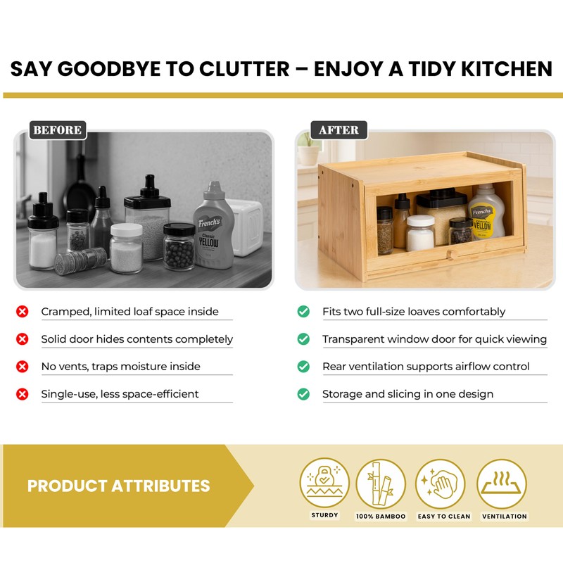 • Dual-Purpose Sliding Tray: Bottom board doubles as a bread-cutting surface, helping to contain crumbs and save counter space.