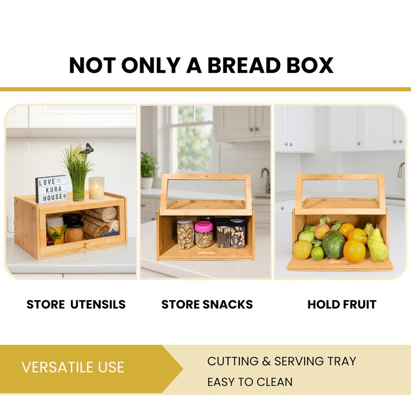 KuraHouse Bamboo Bread Box for Homemade Loaves – Large Countertop Bread Storage Container Farmhouse with Sliding Tray, Window Bread Holder