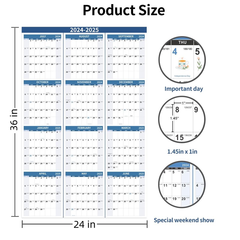 - EFFICIENT LIFE: Using this 2024-2025 wall calendar allows you to better organise your life by marking off important meeting days, appointments, birthdays, anniversaries, and days that have special meaning to you.