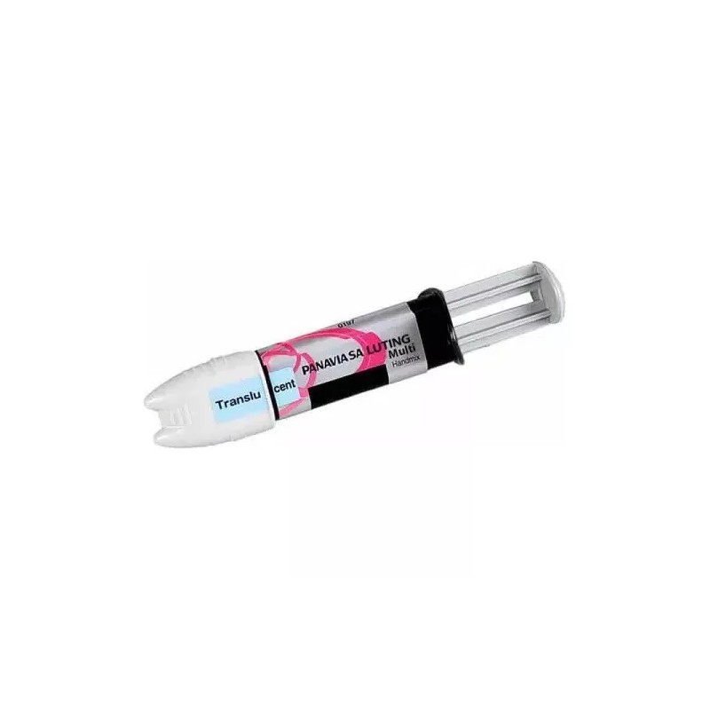 PANAVIA™ SA LUTING Multi es un cemento de resina autoadhesivo radiopaco, de polimerización dual (fotopolimerización y/o autopolimerización), liberador de fluoruro, para restauraciones de cerámica (porcelana, disilicato de litio, circonio, etc.), resina compuesta y metal. . Tiene la opción de entrega Automix (se combinan cantidades iguales de dos componentes a través de una punta de mezcla) o Handmix (se combinan cantidades iguales de dos componentes en una almohadilla de mezcla).