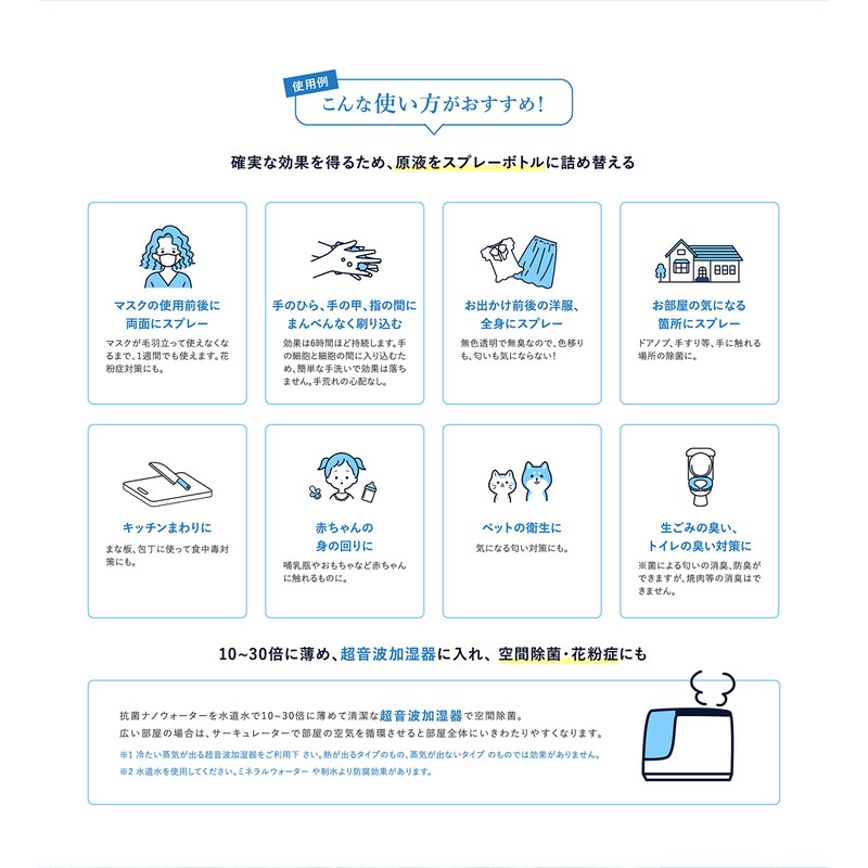 - When using an ultrasonic humidifier, please dilute it 10 to 30 times with purified water (pure water)