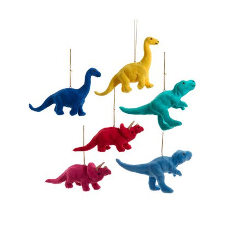 - This set includes six assorted ornaments, each featuring a different colorful and fuzzy dinosaur, creating a playful and festive collection that captures the imagination