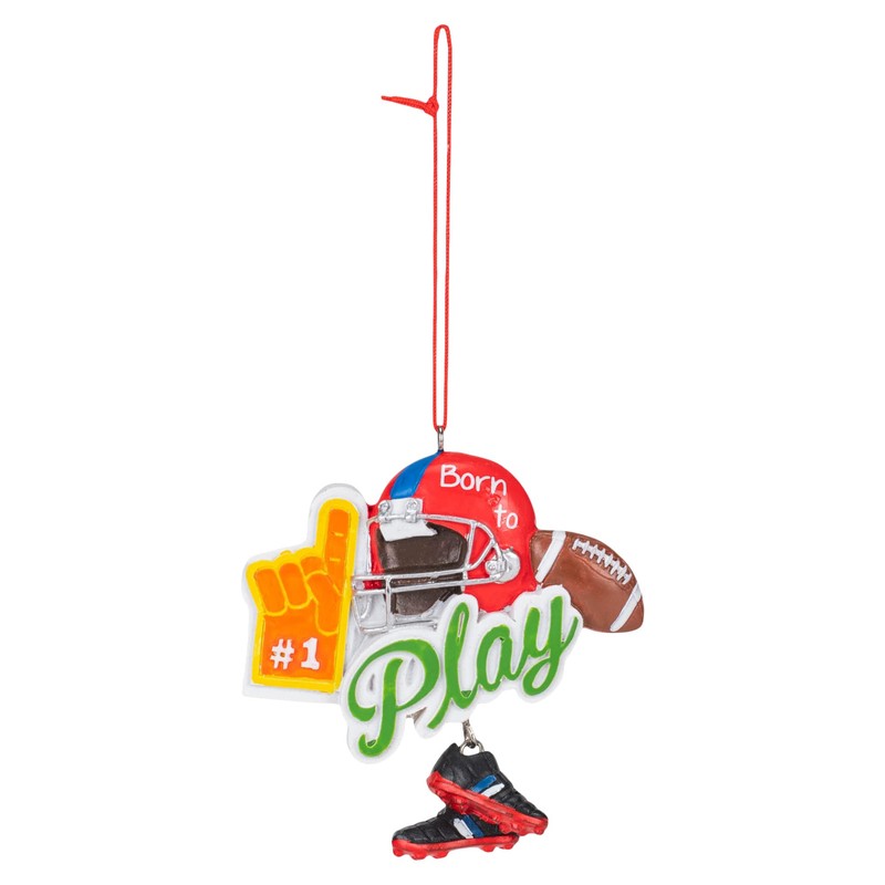 - Features a football, helmet, #1 glove and the sentiment "Play"; Accented by a pair of dangling cleats