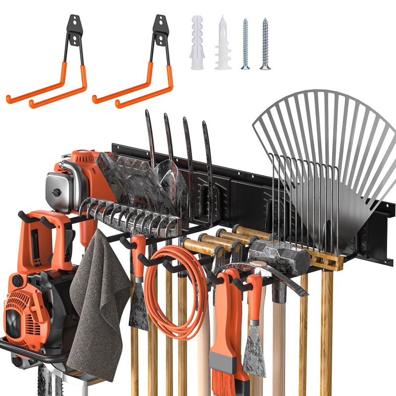 - [Wide Range of Application]: This garden tool rack wall mount is not limited to tools, it can also accommodate broom organization, hose cords, power tools, yard tools, sports equipment and other items; Whether in the garage, foyer storage, yard, garden, basement, tool shed, gym, home, shop, this tool storage rack is applicable