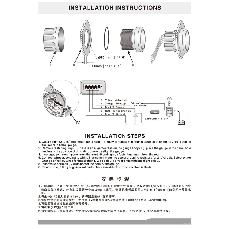 - Fácil instalación: un agujero con 52 mm de dimensión y 55 mm de profundidad en el tablero o un soporte de calibre adicional. Instalación de estilo de montaje en tornillo.