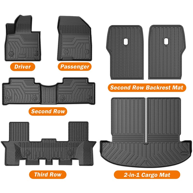 - 【FULL SET OF 7】 Come with 4pcs of 3 Rows Floor Mats, 2pcs of 2nd Row Seat Backrest Mat, 1pcs of Cargo Liner with 3rd Row Seat Back Protector