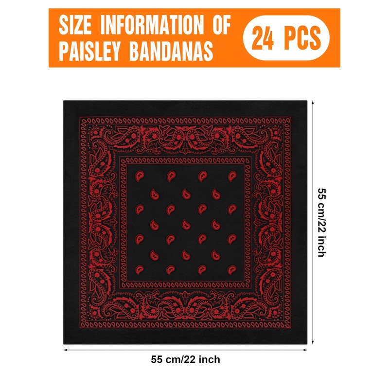 • Abundant Variety: Each pack includes 24 colorful bandanas paisley bulk, featuring a wide range of patterns and hues. With so many choices, you'll always find an ideal match to complement your style and outfit.