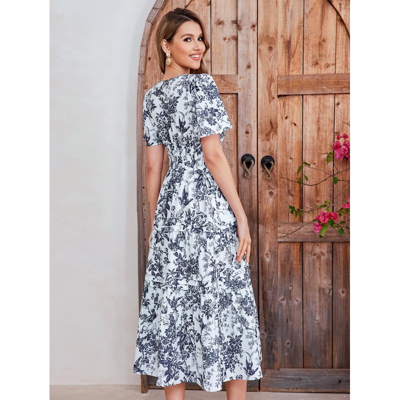 - Features: V neck mid dresses for women, short sleeve boho dress with pockets, invisible buttons at neckline, smocked waist, tiered a-line hem, summer floral print dresses for women 2024