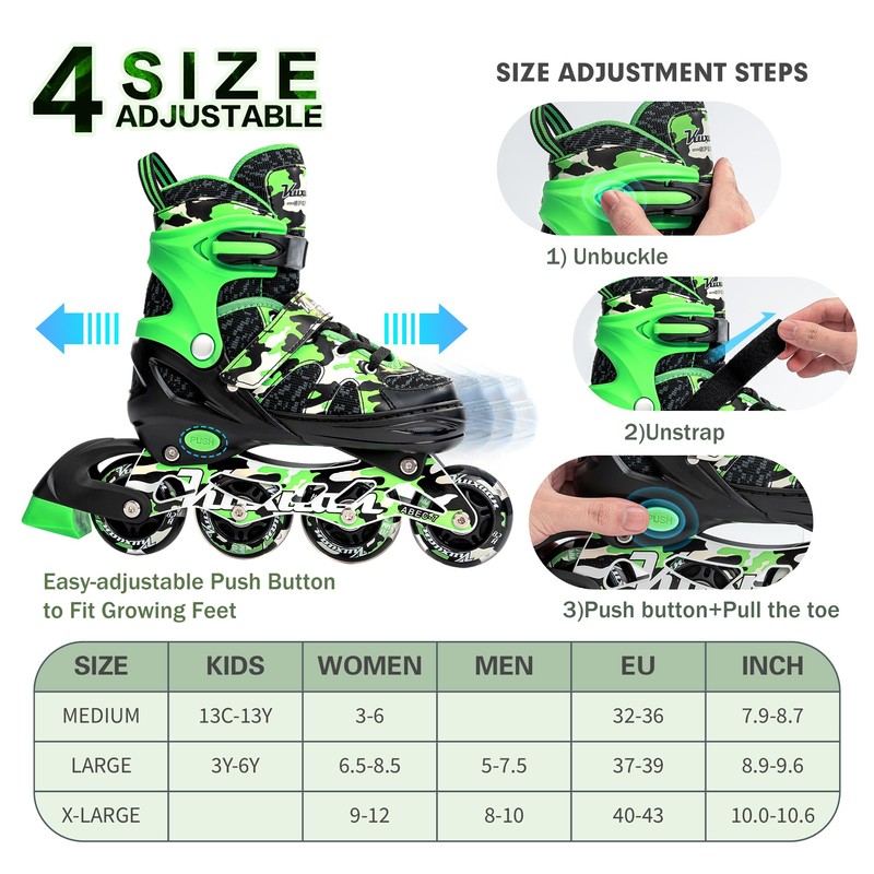 - ONE PAIR FOR FOUR SIZES - Easy and convenient 1 push button to adjust different sizes ensures years of fun. No need to worry about your kid's growing foot anymore. Check our size chart in the product image, make sure you chose the right pair!