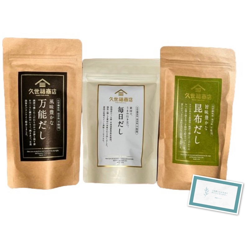 - ・風味豊かな万能だし 40g(8g×5包)【だしパック】…1個 ・素材の、 うまみ引き立つ。 毎日だし 49g(7g×7包)…1個 ・旨味豊かな 昆布だし 40g(8g×5包)【だしパック】…1個