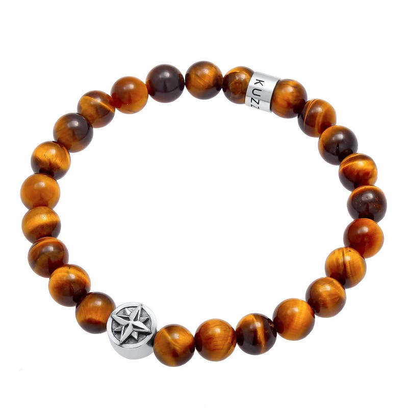 Kuzzoi Buddha 0210482720 Men's Bracelet Made of 925 Sterling Silver, Natural Stone Tiger's Eye Bracelet with Silver Beads, Maritime Wind Rose Compass Symbol, Elastic, Energy Bracelet, Length 19-23 cm,