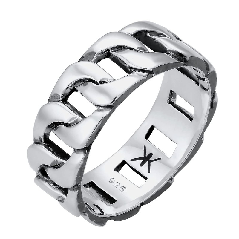 - Handmade silver ring band ring by Kuzzoi in tank link design for bikers, rocker or fashion-conscious men