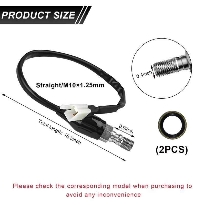 - Especificaciones del producto: la especificación de este interruptor de luz de freno es M12 × 1 mm y M12 × 1,25 mm. Se suministra en dos formas diferentes: curva y recta. Comprueba la información del producto antes de comprar para asegurarte de que es adecuada para tu motocicleta.