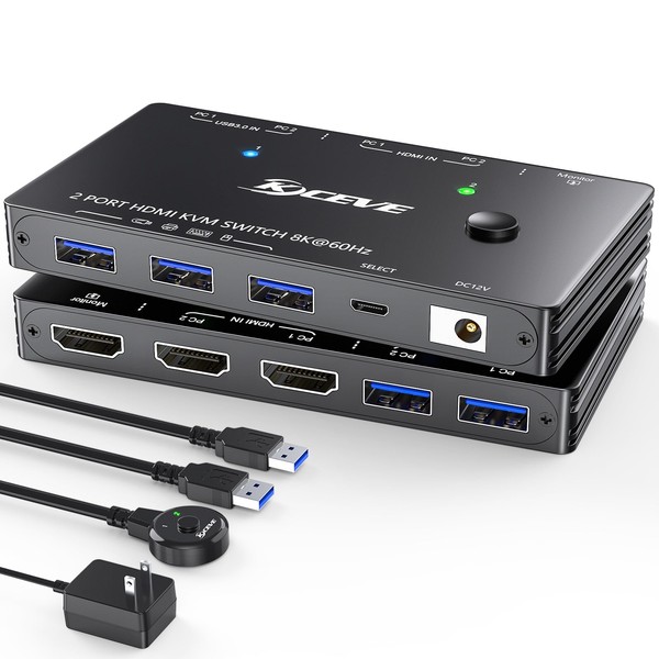 KVM Switch 1 Monitors 2 Computers 4K@144Hz 8K@60Hz, HDMI USB3.0 KVM Switches with 3 USB 3.0 Port,Wired Remote,Power Adapter and USB3.0 Cables Included(8K 2 PC 1 Monitor KVM)
