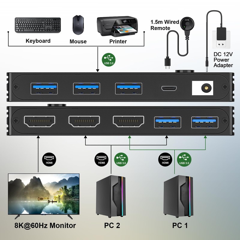 - 【8K@60Hz KVM】 8K KVM switch supports up to 8K@60Hz. ✔✔✔Warming: Please use HDMI2.1, if the set distance allows,the length of cabels more short more better.