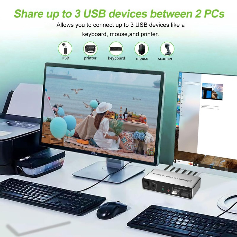 - Boost Productivity with Dual Monitor KVM Switch: Easily switch between two computers using our HDMI Displayport KVM switch that lets you share two monitors, a keyboard, and a mouse. Control either PC at the press of a button to suit your work needs.