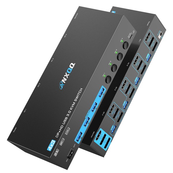 8K@60Hz/4K@144Hz KVM Switch 4 Computers 3 Monitors, ANXQQ HDMI KVM Switch Displayport Share 4 USB 3.0 Devices, Support Mirror/Extended Mode, with 4 USB Cables, Wired Remote and Power Adapter