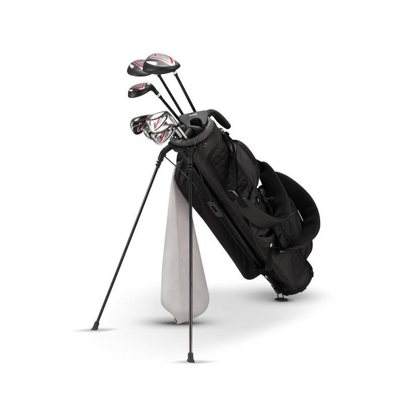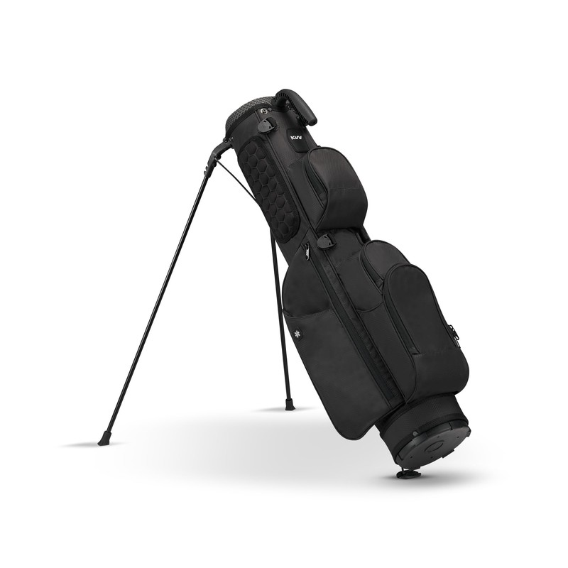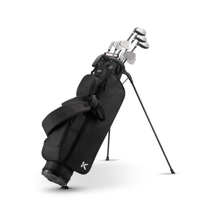 - Stable & Reliable Stand: Simply press down on the bag, and the two sturdy metal brackets automatically unfold to create a stable triangular base. This allows golfers to easily reach the clubs without knocking their bags over.